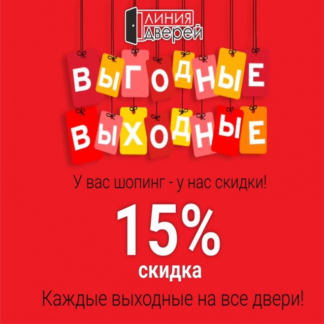 В фирменном салоне "Линия Дверей" Каждые выходные проходит акция "Скидка 15 % на все двери".